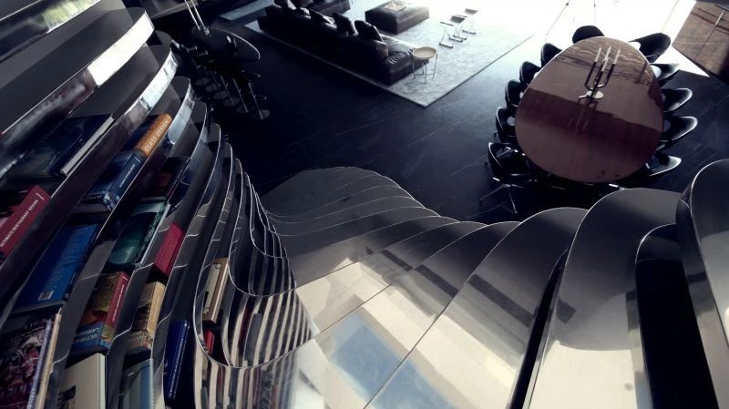 通往上層的樓梯,利用拋光不銹鋼材質(zhì)做表皮,整體造型呼應(yīng)了建筑外墻。樓梯由 23 個(gè)臺(tái)階組成,曲面的臺(tái)階一直延伸到墻壁變?yōu)闀埽w以「共生」作為主要理念▽