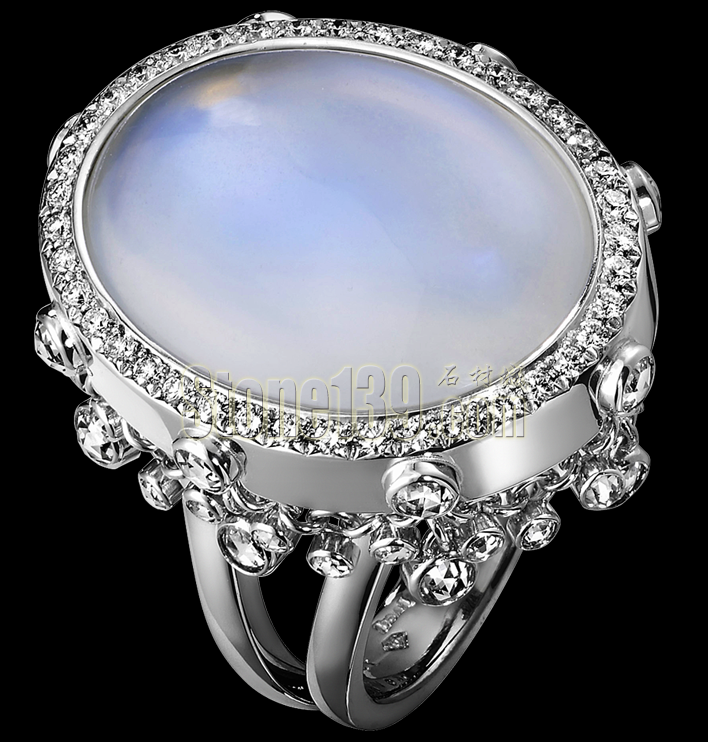 2、月長石:(礦物學(xué)名叫“微斜長石”)因為具有“月光效應(yīng)”(石中心出現(xiàn)恍若月光的幽藍(lán)或亮白的暈彩)而被叫做月光石。由兩種長石混合組成。其中,冰長石和鈉長石混合組成最常見。質(zhì)量好的月光石呈半透明狀,有似波浪漂游的藍(lán)光。較差的呈半渾濁狀。更低檔的只有暈彩沒有藍(lán)光。因可招來美好如月光般的浪漫愛情,又稱“情人之石”