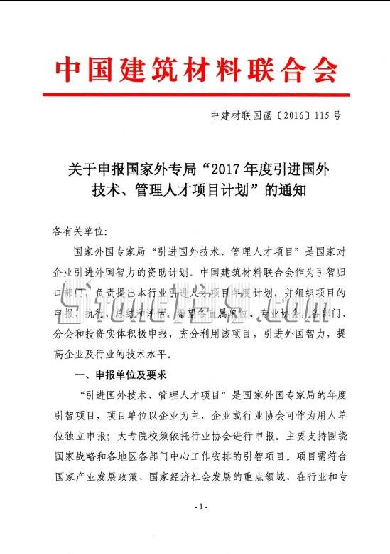 現(xiàn)轉(zhuǎn)發(fā)中國(guó)建筑材料聯(lián)合會(huì)“關(guān)于申報(bào)國(guó)家外專(zhuān)局‘2017年度引進(jìn)國(guó)外技術(shù)、管理人才項(xiàng)目計(jì)劃’的通知”。