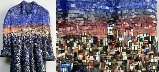 另一條以藍(lán)綠色為主色調(diào)的長衫,則是藝術(shù)家試圖表現(xiàn)某一次開車到海灣對面的公園景點(diǎn),身處寧靜海灣遠(yuǎn)眺對面人潮洶涌的舊金山城的感受,那份安寧與喧囂的巨大反差給了藝術(shù)家難忘的心靈震撼。