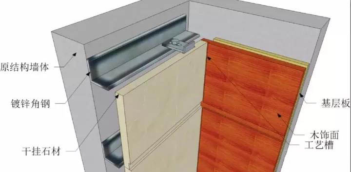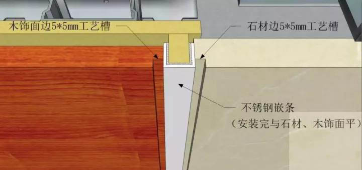 木飾面與石材交界邊緣如圖所示抽槽處理,石材壓木飾面,防止橫向工藝槽陰角處收口露空洞