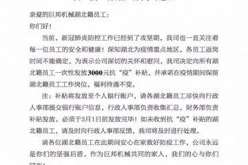 置頂巨邦機(jī)械發(fā)布關(guān)于發(fā)放湖北籍員工 一次性3000元抗“疫”補(bǔ)貼及保崗的通知