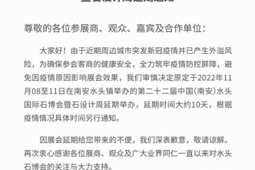 第二十二屆中國(南安)水頭國際石博會(huì)暨石設(shè)計(jì)周延期了!原定于2022年11月8日至11日舉辦的第二十二屆中國(南安)水頭國際石博會(huì)暨石設(shè)計(jì)周延期舉辦,延期時(shí)間大約10天,根據(jù)疫情情況具體時(shí)間另行通知!請(qǐng)石材人…