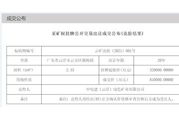 日前由于中止競拍備受爭議的廣東省云浮市礦山終于在今日以61億的價(jià)格被中電建(云?。┚G色礦業(yè)有限公司收入囊中。據(jù)悉,該采礦權(quán)位于廣東省云浮市,礦區(qū)面積23544平方公里,可開采建筑用花崗巖,出讓資源儲量2276…