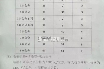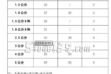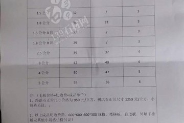 厚度光面毛板(元/平方)火燒面毛板(元/平方)切邊費(元/平方)1.5cm33/31.8cm353431.5B料27/31.8B料29/32.5cm433843.0cm464144.0cm555055.0cm65596注:毛板價格+切邊費=成品價格路沿石料常規(guī)規(guī)格1000元/立方,…
