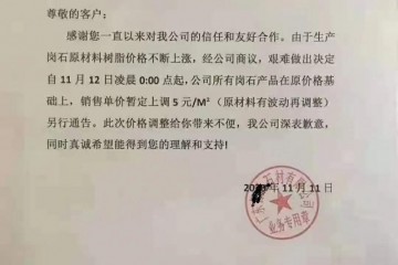 調(diào) 價 通 知 函尊敬的客戶:感謝您一直以來對我們公司的支持與厚愛,由于石材行業(yè)旺季來臨,礦山原料緊張,造成生產(chǎn)成本大幅上升,我司通過內(nèi)部成本控制和挖據(jù)潛能無法克服以上成本壓力,秉著誠信服務(wù),互利共贏…