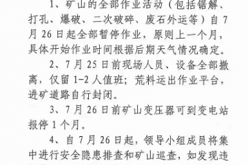 暫停作業(yè)通知1、礦山的全部作業(yè)活動(包括鋸解、打孔、爆破、二次破碎、廢石外運等)自7月26日起全部暫停作業(yè),原則上一個月,具體開始作業(yè)時間根據(jù)后期天氣情況確定。2、7月25日前現(xiàn)場人員、設(shè)備全部撤離,僅留1-2…