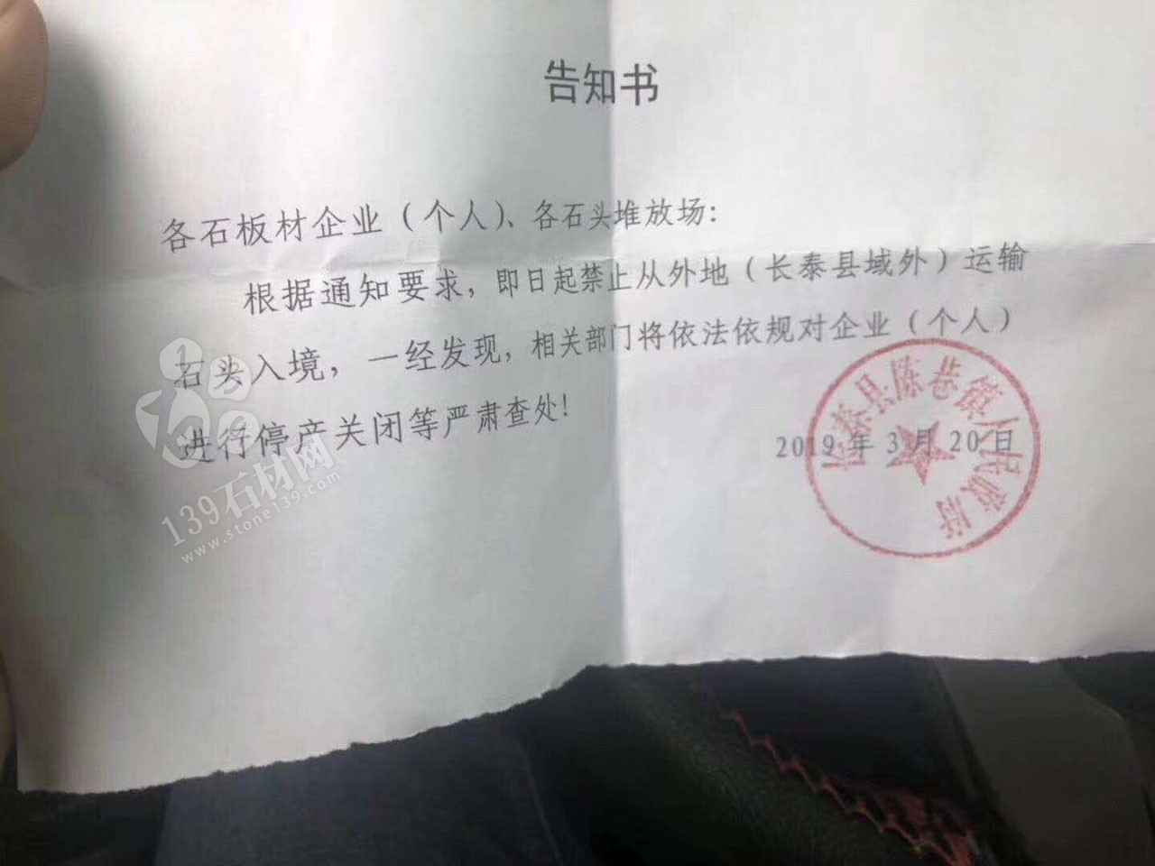 更有消息稱:長泰縣禁止從外地運(yùn)輸石材入境,違者停產(chǎn)關(guān)閉處理,蓋章原件: