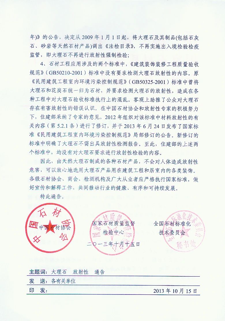 南方日?qǐng)?bào)在2013年也曾報(bào)道介紹,國(guó)家石材質(zhì)量監(jiān)督檢驗(yàn)中心近10年來(lái)對(duì)市場(chǎng)上常用的100余種國(guó)產(chǎn)及進(jìn)口大理石樣品進(jìn)行的放射性檢驗(yàn)結(jié)果顯示,所有被檢大理石樣品放射性核素比活度平均為002,僅為國(guó)家標(biāo)準(zhǔn)《建筑材料放射性核素限量》中A類(lèi)指標(biāo)(產(chǎn)銷(xiāo)與使用范圍不受限制)的五十分之一,完全可以忽略不計(jì)。