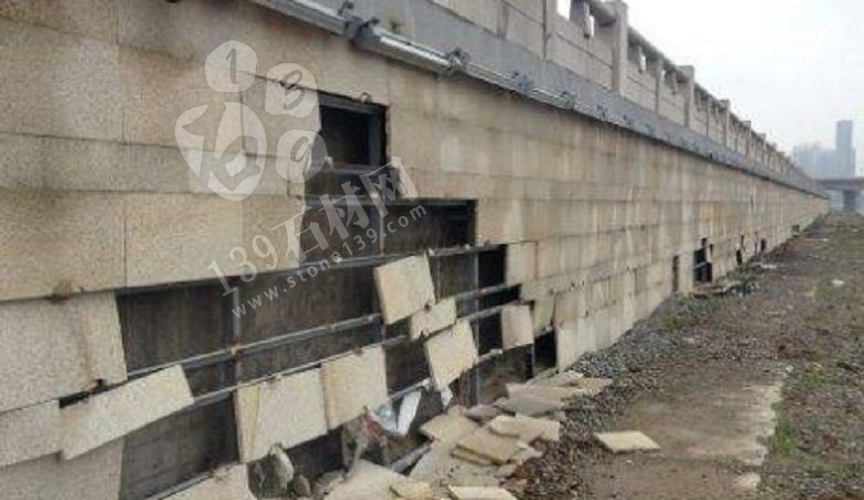 1、干掛石材厚度不足“脫落板塊厚度16mm,業(yè)主設(shè)計(jì)為保證紋理效果,挑選成品板厚度誤差較大),雖然背面用150mm x 50mm崗石背條加固。但由于石材背面背膠層粘結(jié)力差,導(dǎo)致背條連同背膠層從石材背面剝落;