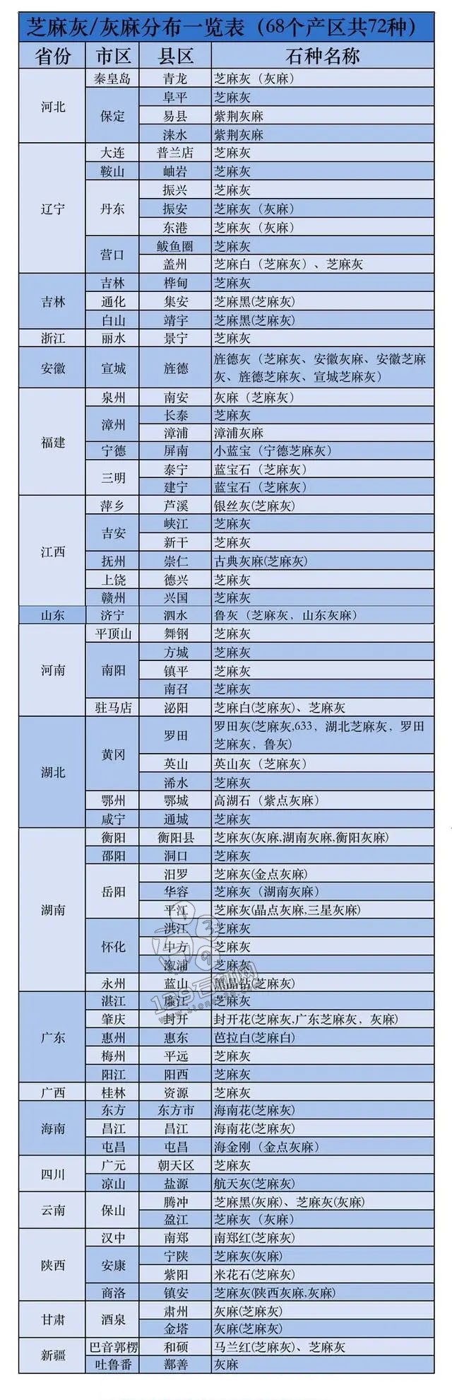 芝麻灰/灰麻分布一覽表(68個(gè)產(chǎn)區(qū)共72種