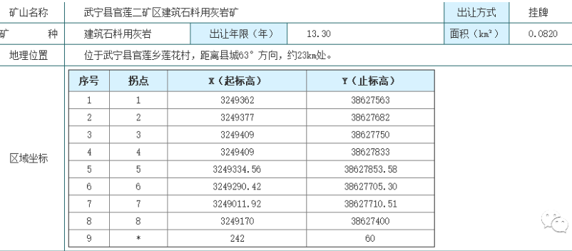 三、出讓采礦權(quán)基本情況 項目名稱:武寧縣官蓮二礦區(qū)建筑石料用灰?guī)r礦 開采礦種:建筑石料用灰?guī)r 地理位置:位于武寧縣官蓮鄉(xiāng)蓮花村,距離縣城63°方向,約23km處。面積:0.082平方千米,拐點坐標如下(2000國家大地坐標):