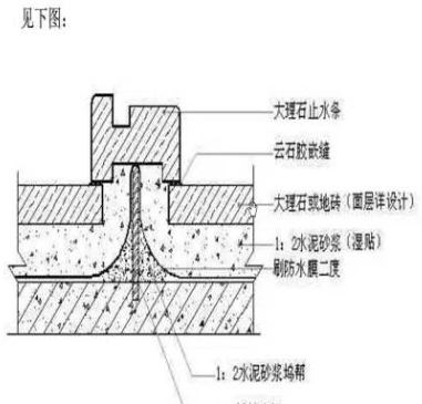 6) 在淋浴房下口設(shè)置止水鋼片,高度同裝飾地面厚度,用膨脹螺栓固定牢 固,用1:2.5 水泥砂漿,粉成圓弧泛水,然后在泛水上設(shè)置防水附加層;