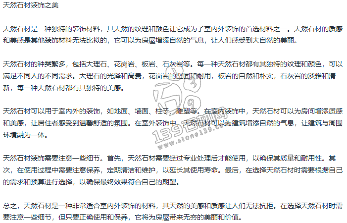 總之,天然石材是一種非常適合室內(nèi)外裝飾的材料,其天然的美感和質(zhì)感讓人們無法抗拒。在選擇天然石材時(shí)需要注意一些細(xì)節(jié),但只要正確使用和保養(yǎng),它將為房屋帶來無窮的美麗和價(jià)值。