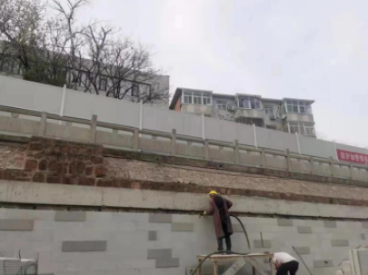 因護(hù)岸樁擋墻為H型預(yù)制構(gòu)件,完成后接縫處不可避免存在不平整粗糙面,汛期對(duì)行洪有一定程度的影響,非汛期對(duì)行人也存在一定的安全風(fēng)險(xiǎn),且裸露的護(hù)岸樁或擋墻觀感較差,根據(jù)國(guó)內(nèi)類似工程經(jīng)驗(yàn),對(duì)表面進(jìn)行處理是必要的。目前,國(guó)內(nèi)采用的通用處理方式主要有石材掛貼、石材濕貼、混凝土預(yù)制板材掛貼等。根據(jù)測(cè)算,單位面積投資中,混凝土預(yù)制板材掛貼單價(jià)過(guò)高,石材掛貼和濕貼投資相當(dāng),但石材濕貼易脫落、影響安全,經(jīng)技術(shù)經(jīng)濟(jì)比較,選用石材掛貼工藝。具體施工中,所用石材為花崗巖,而非大理石,采用的是“先掛石材、后灌漿”的掛貼施工工藝,而非一般建筑立面采用的“干掛石材”施工工藝,具有較好耐久性、安全性。經(jīng)計(jì)算,金水河若遇100年一遇洪水,其洪水流速在2—3米每秒,掛貼花崗巖立面可抵抗該流速的沖刷。