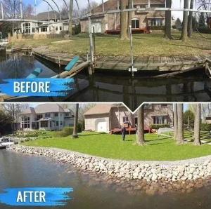 砌石護(hù)岸的做法,先挖地基,再打地釘樁,其上再修砌石堤。