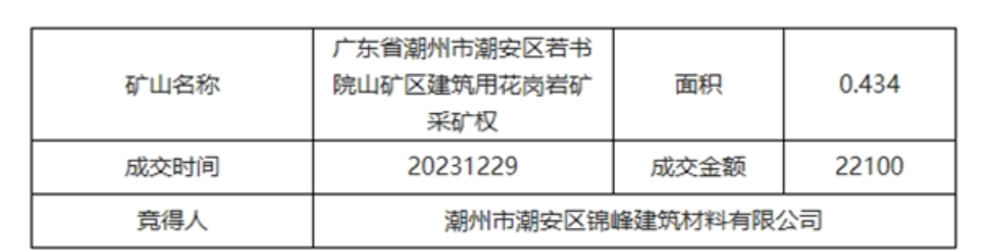 該礦資源儲量2313.14萬方,可采儲量為建筑用花崗巖資源量2035.69萬方,生產(chǎn)規(guī)模150萬方/年,擬出讓年限14年9個月,起始價21100萬元(約2.1億元),成交價22100萬元(約2.2億元)。