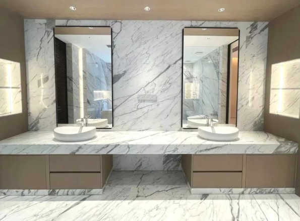 雪花白大理石是一種高檔的裝飾材料,常用于高檔場(chǎng)所的內(nèi)部裝飾。在廚衛(wèi)空間中,雪花白大理石因其純凈的色彩和良好的光澤度,能夠營(yíng)造出高雅和奢華的氛圍。以下是一些雪花白大理石廚衛(wèi)空間的案例: