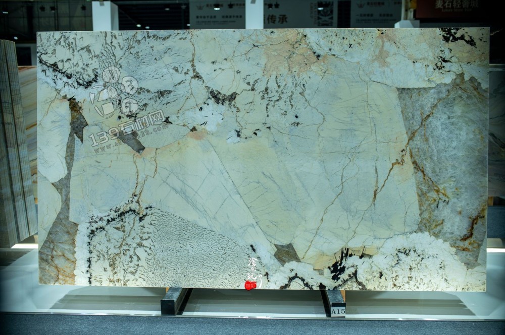 A16(第二張):紋理如 **“云漫山巒”** 。上層細(xì)碎深色紋路,似淡墨勾出的遠山輪廓;中間大塊淺米色基底,隱現(xiàn)纖細(xì)金紋,像山澗溪流;底部 “灰白沙灘” 與 “墨色礁石” 交錯,是溪水匯入深潭的瞬間,天然成畫。