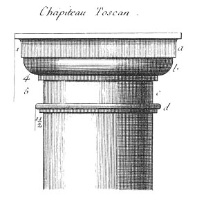 塔司干柱式其實(shí)就是去掉柱身齒槽的簡化多立克柱式,柱礎(chǔ)是較薄的圓環(huán)面。柱高跟柱徑的比例是7:1,柱身粗壯。