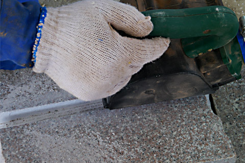 開槽前,花崗巖先要用云石機(jī)載石材的側(cè)面開槽,開槽深度依照掛件的尺寸進(jìn)行,一般要求不小于10mm,并且在板材后側(cè)邊中心,為了保證開槽不崩邊,開槽距邊緣距離為1/4邊長且不小于50mm,并將槽邊的石灰清理干凈以保證灌膠粘接牢固。具體步驟如下: