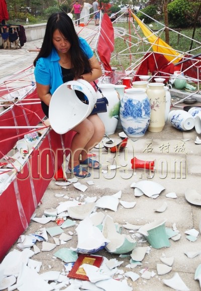 陳買金說,待大風(fēng)過后她們?nèi)笛哿?,大量展品被砸成了碎片,她的展位上的瓷器相?duì)便宜一點(diǎn),粗略估算了一下?lián)p失也不下6萬元。
