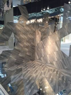 展位設(shè)計(jì)啟用的意大利團(tuán)隊(duì),由法國(guó)羅浮宮博物館修繕設(shè)計(jì)大師盧卡•羅西(Gianluca Rossi)率領(lǐng),這位被譽(yù)為“空間藝術(shù)的先鋒騎士”采用大理石的表現(xiàn)手法呈現(xiàn)簡(jiǎn)一大理石瓷磚的逼真效果。