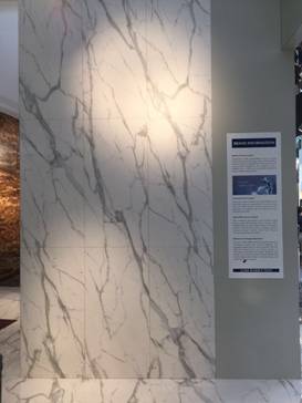 在展位布置上,不僅將技術(shù)工藝再度升級(jí)的新一代大理石瓷磚與相對(duì)應(yīng)的天然石材做比對(duì)陳列,地面也全部采用不同效果的新品雪花白2,直觀展現(xiàn)了新品一石N面、表面紋理自由拼接可達(dá)到基本連體的特征。