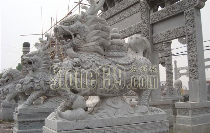 漢人許慎案《禮記》時又提出了新的說法:“麟鳳龜龍謂之四靈,龍東方也,虎西方也,鳳南方也,龜北方也,麟中央也。 這就把四靈說與四獸說相融了,形成了五靈之說。囚而后世典籍中有麟鳳五靈,王之嘉瑞,以及“麟鳳與龜龍白虎五者,神靈之鳥獸,王者之嘉瑞也”的說法。很明顯五靈是四靈與四獸的綜合,五靈說又與當時流行的“五行”、“五帝”相配,進一步完善五靈說。在《禮緯·稽命微》中說:“古者以五靈配五方:龍木也,鳳火也,麟地也,白虎金也,神龜水也。《月令章句》也說:“天官五獸之于五事也,左蒼龍大辰之貌,右白虎大梁之久,前朱雀鶉火之體,后玄武龜蛇之質(zhì),中有大角軒轅麒麟也。這時候的浮雕麒麟已經(jīng)應(yīng)用廣泛,這時候也出來了大門口擺放石雕麒麟的傳統(tǒng)。