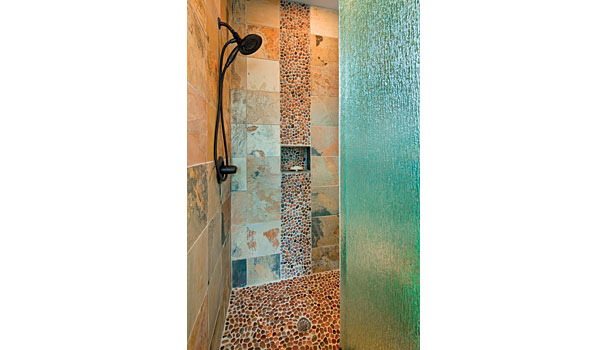 浴室用的鵝卵石做地板,感覺(jué)不一樣的腳下體驗(yàn) 顏色為淡紫色 墻面也有部分鵝卵石馬賽克的應(yīng)用
