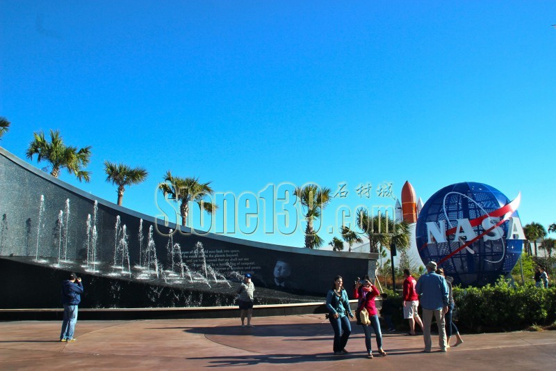 喬恩•Havlak設(shè)計(jì)師PGAV目的地和設(shè)計(jì)師的噴泉,想要進(jìn)入噴泉肯尼迪航天中心的精神象征的地方美國火箭發(fā)射和歷史。 “NASA授予鄰藍(lán)色美國宇航局標(biāo)志球體,它就像一個(gè)同伴的噴泉組成、“Havlak說。 “彎曲的黑墻從右向左傾斜象征著飛行的火箭發(fā)射和領(lǐng)導(dǎo)到達(dá)客人的眼睛到鄰近的肯尼迪火箭花園,早期美國的火箭和太空歷史顯示。 這個(gè)彎曲的墻是穿著的深藍(lán)色珍珠花崗巖與水晶斑點(diǎn),這是選擇空間和明星的象征。 這作品尤其是晚上當(dāng)晶體反映展示照明和創(chuàng)建一個(gè)星域的黑石的背景。 弧形墻頂部裝有不銹鋼蒸汽痕跡的樂隊(duì)和結(jié)束元素后,火箭飛行。