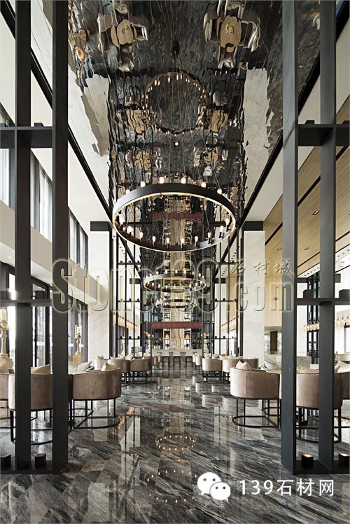 主要材料:太空灰大理石、梵高大理石、清水玉大理石、火山巖大理石、水曲柳洗白、黑鐵氟碳漆、樟木雕刻、鏡面不銹鋼