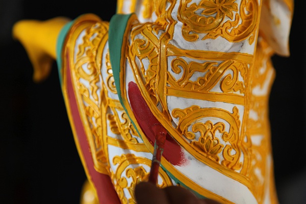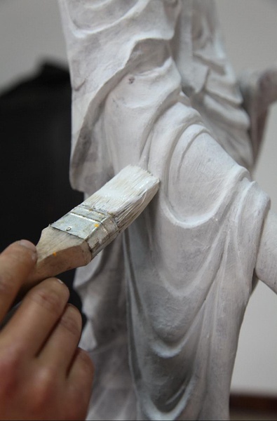 第一層“糙泥”:根據(jù)粉本樣式確定各部位體量的比例關(guān)系、形體的姿態(tài)以及衣紋的疏密排列。