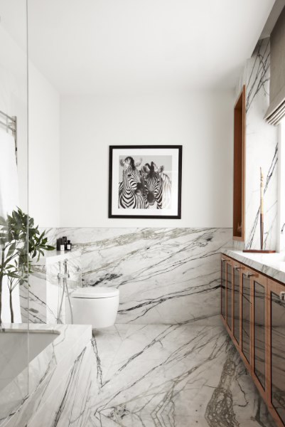 豐富紋理的大理石浴室可以分割空間本身就是一種設(shè)計手段,木柜溫暖了整個冰冷的空間。墻上的斑馬賦予空間一種野生的感覺,明亮的自然光沉寂在整體氛圍。