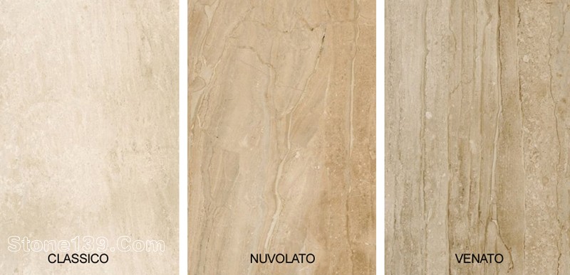 Real Daino有不同的分類。有些有紋路,有些沒有紋路。沒有紋路的分類通常叫做CLARO CLASSICO。有紋路的種類可以分為直線紋路(也稱作VENATO)或者有變化的紋路,被命名為NUVOLATO。然而,所有的Real Daino都是米黃色的,盡管色調(diào)可能有深有淺。