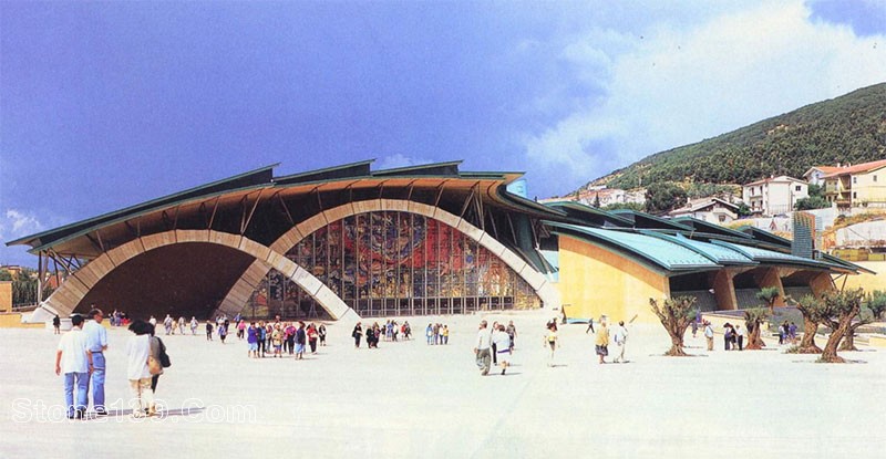 3、建筑師倫佐 皮亞諾和工程師彼得?懷斯合作設計的意大利教士朝圣教堂(Padre Pio Pilgrim-age),利用了當?shù)氐氖牟⒉捎昧撕髲埑兄剡@一石材運用的新技術,形成了45m跨度的石拱結(jié)構,創(chuàng)造了石材跨度的歷史之最.而整個建造過程也是石材開采、工廠加工、施工過程一系列的高新技術的運用成果,將石材的性能發(fā)揮到了極致。