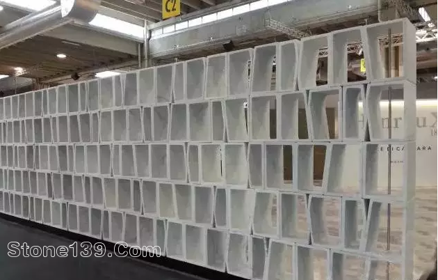 當(dāng)然,除了看石材,這里還可以看到各種創(chuàng)意無(wú)限的產(chǎn)品展示方式和石材加工設(shè)計(jì)。石材砌成的鏤空墻面,每一個(gè)鏤空形狀都不一樣。
