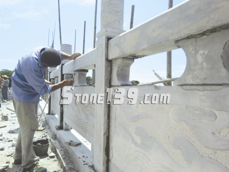 石材欄桿安裝在臺基四周、橋的兩側(cè)、樓梯兩側(cè)、廊柱兩側(cè)、亭榭周邊等處,起到防護(hù)的作用,同時(shí)也可以用來分割空間。尤其在園林建筑中,石欄桿是最不可少的,既可以攔隔圍護(hù),將不同的區(qū)域分隔開來;又不會割斷各區(qū)域之間的聯(lián)系,石欄桿上雕刻的圖案還起點(diǎn)綴環(huán)境的作用。