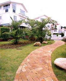 紅磚鋪就的庭園小徑,中間嵌入帶花紋的水泥預(yù)制板