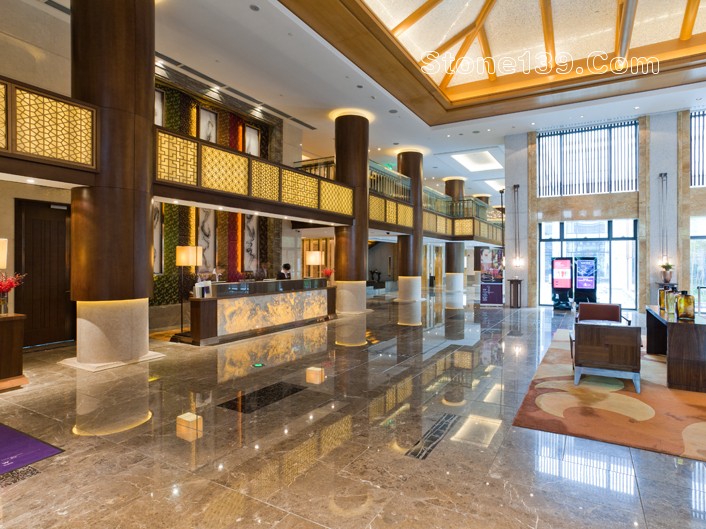 不過今天主要討論的是該酒店的石材裝飾部分。該石材工程主材為伊利諾灰、意大利木紋,主要加工部位為大堂、宴會廳及走廊燈,含雕刻、拼花、線條燈多種產品類型。下面就一同來欣賞吧。