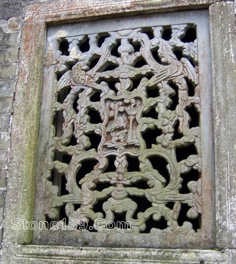首先,從中間的“福”字講起吧。這石窗“福”字四周有四只蝙蝠,蝙蝠間還鑲有祥云。古時(shí)蝠喻為福?!侗阕印氛f:“千歲蝙蝠,色如白雪,集則倒懸,腦重故也。此物得而陰干末服之,令人壽萬歲”。蝙蝠在中國(guó)傳統(tǒng)文化中象征“福氣”。民間繪畫中常畫五只蝙蝠,意為《五福臨門》。這圖則含“福從天降”之意。