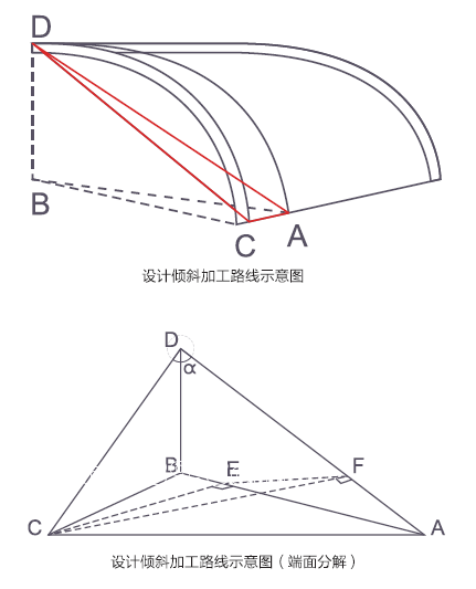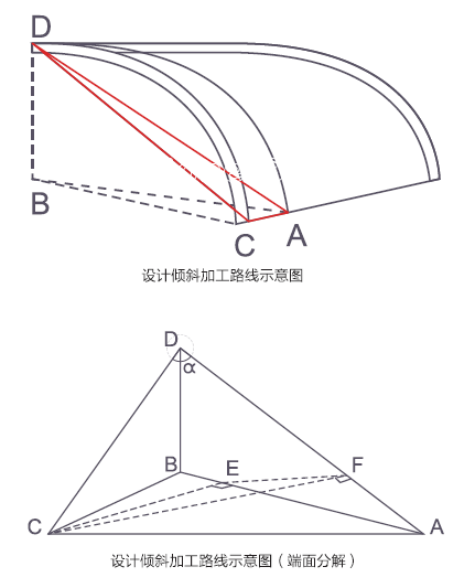 圖中 DB、BC 為弦長;CD 為弧板弦長,AD為斜切后弦長,CA為弧板順高度切除的最大尺寸??梢姡骸螩DA 就是以弧板底面定位時(shí)的工作臺(tái)轉(zhuǎn)角α,∠FCE為扳刀角 β: