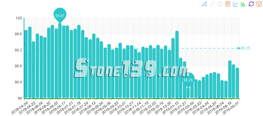 據(jù)“中國·水頭石材指數(shù)”系統(tǒng)監(jiān)測,20160601期石材周價格指數(shù)收報于97.79點,環(huán)比上調(diào)約0.01點,上調(diào)0.01%。本周石材價格幾乎與上周持平,其中除其他石材類價格繼續(xù)持平外,花崗石、合成大理石類價格均繼續(xù)微幅下調(diào),大理石類價格則略回升。本周大部分石材品種價格仍保持穩(wěn)定,隨市場行情下滑,需求萎縮,價格競爭更激烈,除大理石大板價格略回升外,花崗石、合成大理石大板及成品價格均隨市場行情下滑繼續(xù)微幅下調(diào)。