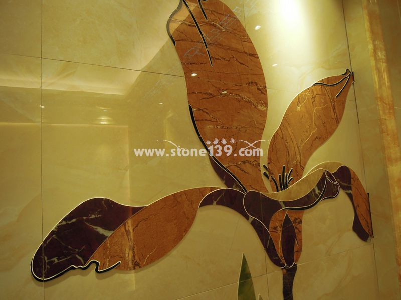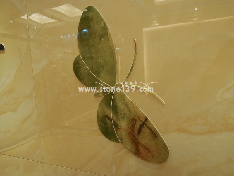 背景墻裝飾 石材拼出的蝴蝶 主要大理石品種有 熱帶雨林 古青玉 紫羅紅 黑色大理石為黑白根