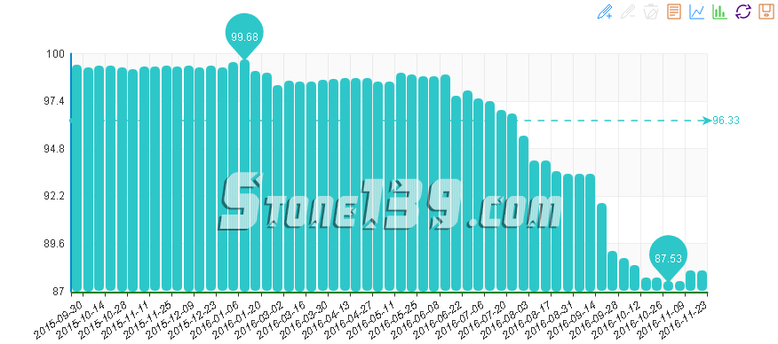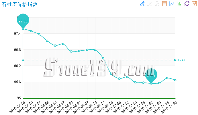 據(jù)“中國(guó)·水頭石材指數(shù)”系統(tǒng)監(jiān)測(cè),20161123期石材周價(jià)格指數(shù)收?qǐng)?bào)于95.88點(diǎn),環(huán)比下調(diào)0.08點(diǎn),下調(diào)0.09%。本周石材價(jià)格波動(dòng)下調(diào),其中花崗石及其他石材類價(jià)格環(huán)比均持平,大理石價(jià)格小幅回落,合成大理石類價(jià)格則繼續(xù)上調(diào)。本周大部分石材品種價(jià)格仍較穩(wěn)定,部分大板價(jià)格隨市場(chǎng)行情波動(dòng)調(diào)整,少數(shù)大理石庫(kù)存舊板有瑕疵,因而降價(jià)幅度較大。