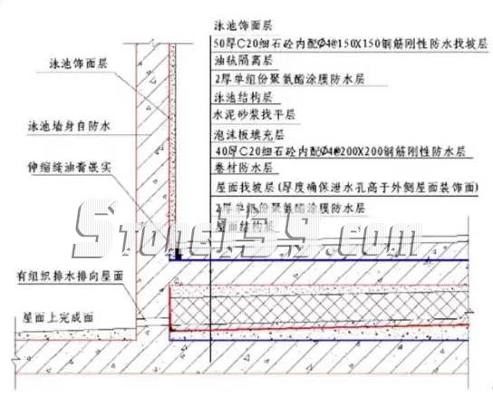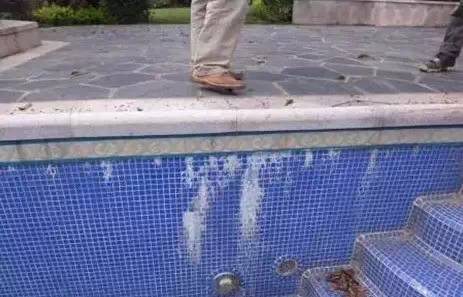 (2)游泳池壓頂施工不符合要求,產(chǎn)生泛堿現(xiàn)象。
