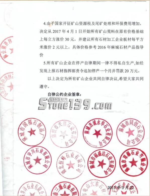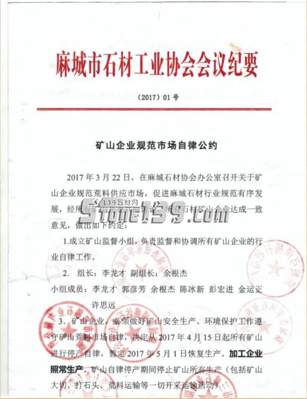2017年3月25日,麻城市石材工業(yè)協(xié)會(huì)召開(kāi)2017年首次行業(yè)大會(huì),就推進(jìn)礦山企業(yè)規(guī)范荒料供應(yīng)市場(chǎng),促進(jìn)麻城石材行業(yè)規(guī)范有序發(fā)展,經(jīng)所有礦山企業(yè)共同討論,所有石材礦山企業(yè)達(dá)成一致意見(jiàn),考慮資源的稀缺性,不再賤賣資源,從2017年4月1日開(kāi)始采取按需供應(yīng)荒料,從2017年4月15日起所有礦山暫停開(kāi)采活動(dòng),暫定2017年5月1日恢復(fù)開(kāi)采,加工企業(yè)照常生產(chǎn)。