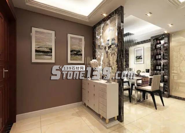 擺脫入門即見餐廳的直白,放入雕花石材屏風(fēng),漸層式的安排幫主人很好的遮擋住了日常隱私,對(duì)空間入室動(dòng)線也進(jìn)行了合理規(guī)劃。