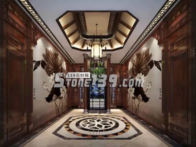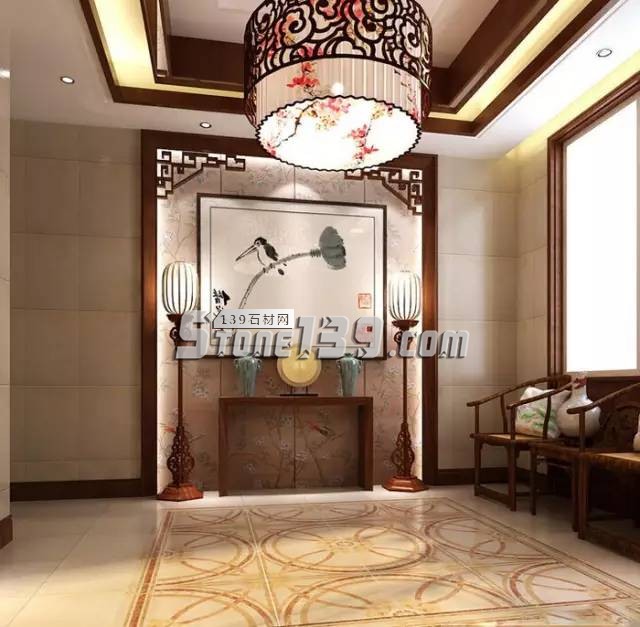 花鳥圖、雕花欞、中式燈、石材水刀拼花,這些元素讓空間節(jié)奏迅速緩下來(lái)