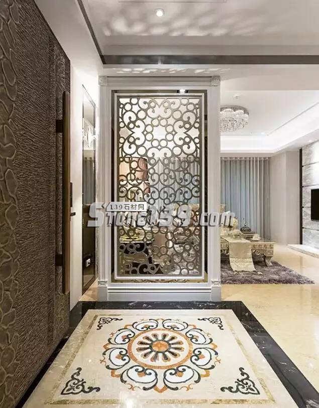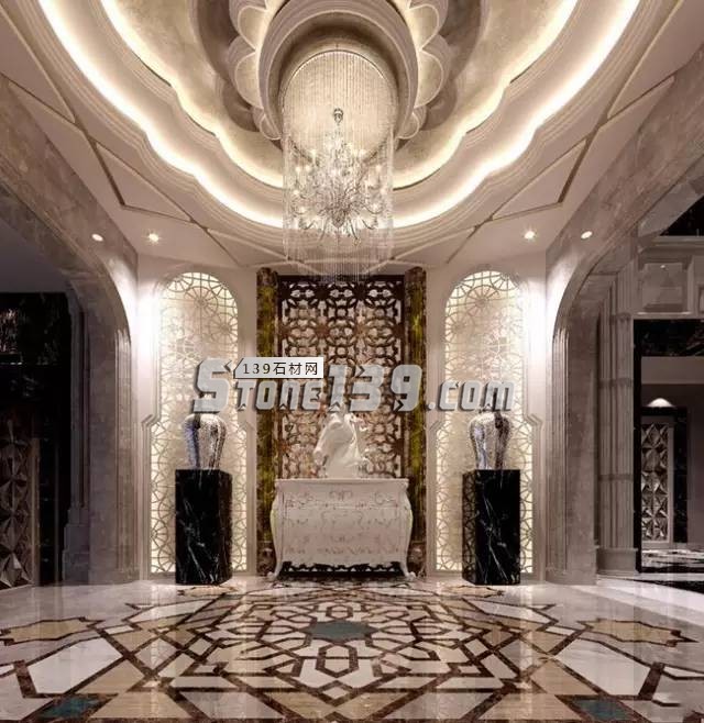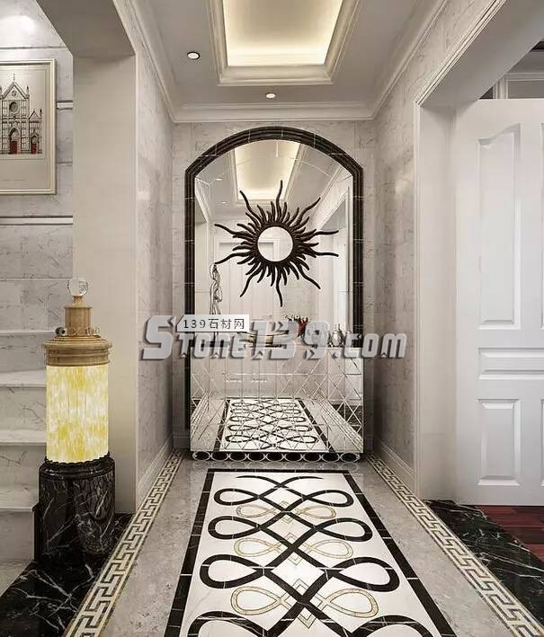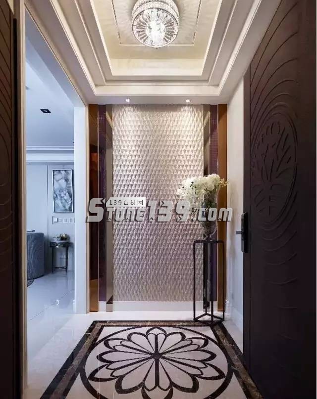 石材拼花圖案底板,搭配反射材質(zhì)的立面,以及線條層層堆疊的天花板,讓玄關(guān)大氣恢弘。